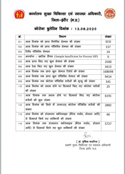 इंदौर। इंदौर में गुरुवार को 157 नए कोरोना पॉजिटिव व 26 रिपीट पॉजिटिव मिले। इस तरह कुल 9414 पॉजिटिव हो गए। आज एक नई मौत के बाद कुल मृतक 341 हो गए।
