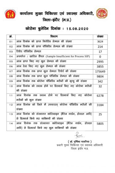 इंदौर। इंदौर में स्वतंत्रता दिवस पर आई मेडिकल रिपोर्ट ने कोरोना का टेंशन और बढ़ा दिया है। आज 214 नए कोरोना पॉजिटिव व 17 रिपीट पॉजिटिव मिले। इसे मिलाकर अभी तक कुल 9804 पॉजिटिव इंदौर में मिल चुके हैं वही एक्टिव मरीज रेकॉर्ड 3184 हो गए है।