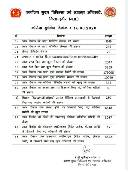 आज 3358 सेम्पल की जांच में 245 पॉजिटिव व 22 रिपीट पॉजिटिव मिले जबकि 3089 निगेटिव मिले। प्रभारी सीएमएचओ डॉ पूर्णिमा गाडरिया की रिपोर्ट के अनुसार अभी तक कुल एक लाख 79 हजार 008 की जांच की जा चुकी है। आज 2047 सेम्पल लिए गए जिनकी अब जांच होगी।