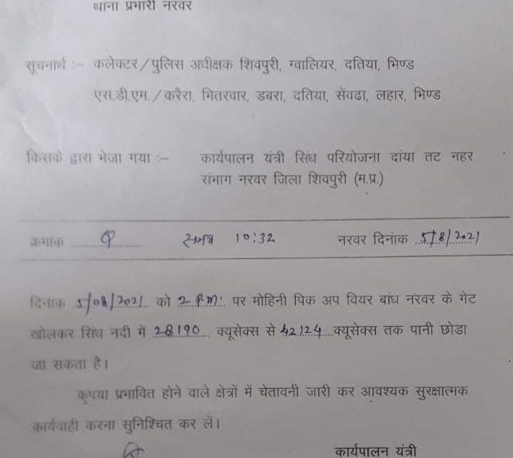 वही एसडीएम करेरा, भितरवार, डबरा,दतिया, सेवड़ा, लहार एवं भिण्ड को अलर्ट जारी किया गया है। जल संसाधन विभाग का पत्र जारी होने के बाद सिंध नदी में पानी का जल स्तर बढ़ने की सम्भावना है और बाढ़ की स्थिति भी देखी जा सकती है। मालूम हो कि शिवपुरी क्षेत्र में लगातार बारिश होने से डेम पुरी तरह से लबालब हो गए है ओर पानी ओवरफ्लो हो गया है। जिससे गेट खोलकर पानी छोड़ा जा रहा है। सेवढा क्षेत्र के आसपास के गांव के लोगो एवं प्रशासन को सतर्क होने की आवश्यकता है। क्योंकि अभी अभी इस सूचना के हिसाब से दोबारा से बाढ़ की स्थिति बन सकती है।