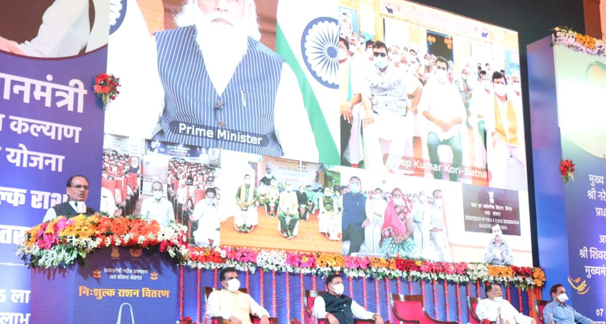भोपाल। प्रधानमंत्री नरेन्द्र मोदी और मुख्यमंत्री शिवराज सिंह चौहान ने आज मध्यप्रदेश में प्रधानमंत्री गरीब कल्याण अन्न योजना के अंतर्गत नि:शुल्क राशन वितरण योजना की शुरुआत की। इस योजना से 25 हजार 435 उचित मूल्य की दुकानों से एक करोड़ 15 लाख परिवारों को दस किलो नि:शुल्क राशन वितरित किया जा रहा है। प्रधानमंत्री कार्यक्रम में वर्चुअल रूप से शामिल हुए और 100 हितग्राहियों को सांकेतिक रूप से दस किलो अनाज के बैग वितरित किए। इस दौरान प्रधानमंत्री मोदी ने हितग्राहियों से आनलॉइन संवाद भी किया। इस मौके पर प्रधानमंत्री ने कहा कि हमारी रणनीति में गरीब पर ध्यान दिया गया, अस्सी करोड़ देशवासियों को मुफ्त राशन दिया गया है। बाढ़ से उपजे हालात पर केंद्र पूर्ण सहयोग देगा। उन्होंने कहा कि आपदा कोई भी हो लंबे समय तक असर रहता है।