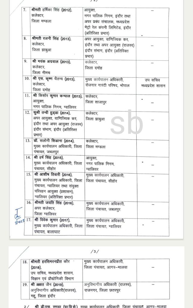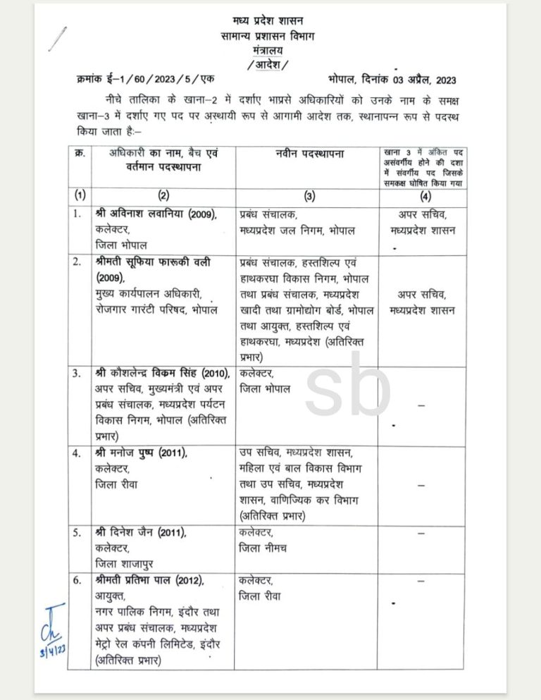 जारी नए आदेश के मुताबिक कौशलेंद्र विक्रम सिंह राजधानी भोपाल के कलेक्टर होंगे। प्रतिभा पाल को उज्जैन नगर निगम कमिश्नर पद से हटाया दिया गया है वे अब रीवा कलेक्टर होंगी। ग्वालियर नगर निगम कमिश्नर किशोर कन्याल शाजापुर कलेक्टर बनाए गए है। हर्ष सिंह ग्वालियर नगर निगम कमिश्नर होंगे। हर्षिका सिंह इंदौर निगम कमिश्नर बनी है।