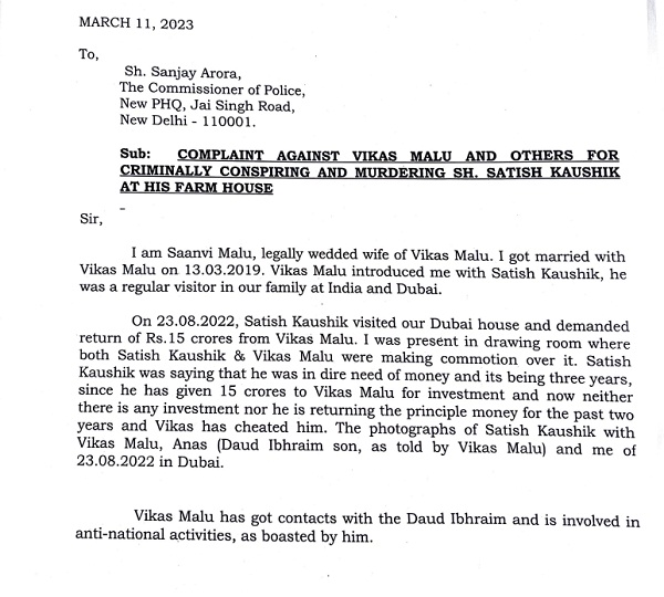 सानवी ने आरोप लगाया कि पूछने पर विकास ने कहा था कि कोविड (covid) में सारे रुपये डूब गए। अब सतीश को कौन रुपये वापस करेगा। इसको किसी न किसी तरह रास्ते हटा दिया जाएगा। इसके लिए विदेशी लड़कियों का इंतजाम कर इसको दवाइयों को ओवरडोज दे दी जाएगी। सानवी ने यह भी आरोप लगाए कि उसके पति से अंडरवर्ल्ड डॉन दाउद इब्राहिम से भी संबंध है। अब होली पर सतीश की विकास के फार्म हाउस पर तबीयत बिगड़ना और उनकी हार्ट अटैक से मौत सब साजिश लग रही है। लिहाजा दिल्ली पुलिस को अब इस पूरे मामले की जांच क्राइम ब्रांच या किसी दूसरी एजेंसी से कराना चाहिए।