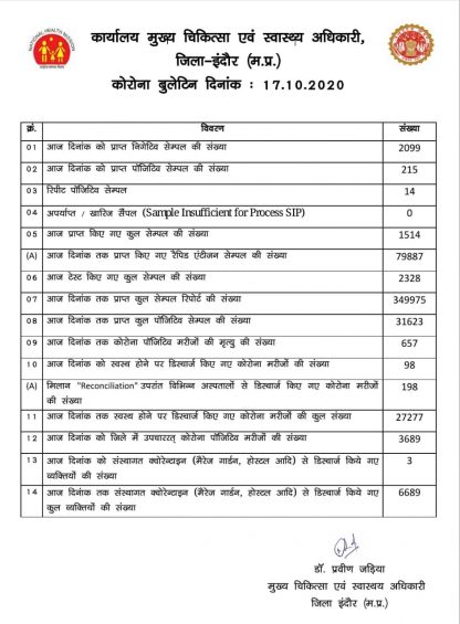 आज 2328 की जांच में 215 पॉजिटिव व 14 रिपीट पॉजिटिव मिले। सीएमएचओ डॉ प्रवीण जड़िया की मेडिकल रिपोर्ट के अनुसार अभी तक कुल 3 लाख 49 हजार 975 की जांच की जा चुकी है। आज 1514 सेम्पल लिए गए जिनकी अब जांच होगी। इसी तरह रेपिड एंटीजन सेम्पल की संख्या 79887 है।