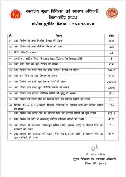 इंदौर। आखिर क्या होगा…..इंदौर में कोरोना पॉजिटिव का शनिवार 26 सितंबर को सर्वोच्च आंकड़ा सामने आया है जिसमे पौने पांच सौ से ज्यादा (478) नए केस मिले है। इसे मिलाकर इंदौर में कुल पॉजिटिव 22 हजार 607 हो गए। ऐसे ही मौते भी बढ़ गई है। आज सात और मौत के बाद कुल मृतक 545 हो चुके हैं।