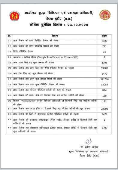 इंदौर। इंदौर में शुक्रवार 23 अक्टूबर को कोरोना पॉजिटिव 33 हजार पार (33054) हो गए। आज अभी तक के सबसे ज्यादा 5477 किये गए टेस्ट की जांच में 271 नए पॉजिटिव मिले जबकि 5189 की रिपोर्ट निगेटिव आई। यानी संक्रमण दर आज भी 5 प्रतिशत से कम रही। इधर आज छह नई मौत के बाद इंदौर में कुल मृतक हुए 674 हो गए।