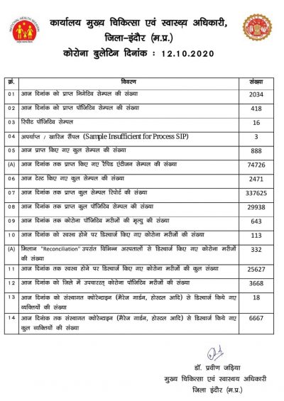 इंदौर। इंदौर में सोमवार 12 अक्टूबर को आई मेडिकल रिपोर्ट में 2471 की जांच में 418 नए कोरोना पॉजिटिव व 16 रिपीट पॉजिटिव मिले। इसे मिलाकर कुल पॉजिटिव 29 हजार 938 हो गए। आज 5 नई मौत के बाद इंदौर में कुल मृतक 643 हो गए हैं।