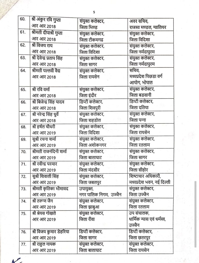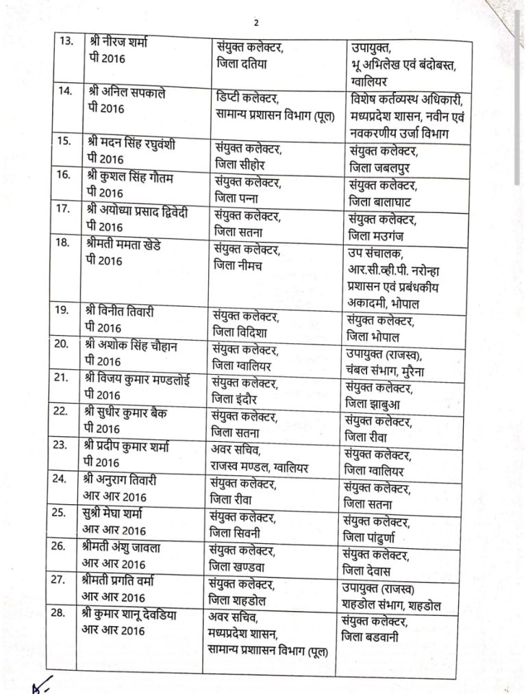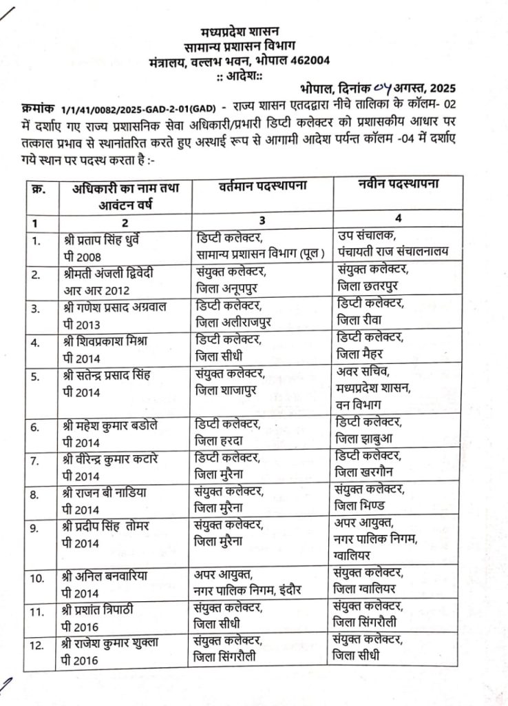 भोपाल। मध्य प्रदेश सरकार ने राज्य में बड़ा प्रशासनिक फेरबदल किया है। इस फेरबदल के तहत भारतीय प्रशासनिक सेवा (IAS) अधिकारियों का तबादला किया गया है, जबकि चार अन्य वरिष्ठ अधिकारियों को महत्वपूर्ण अतिरिक्त जिम्मेदारियां सौंपी गई हैं।