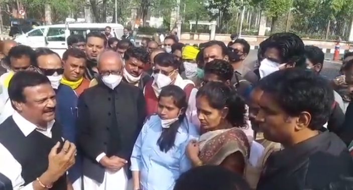 भारती के साथ कांग्रेस नेता राज्यपाल मंगुभाई पटेल से मिलकर उन्हें आरोपितों की गिरफ्तारी की मांग करने का ज्ञापन देने के लिए प्रदेश कांग्रेस कार्यालय में जुटे थे। यहां से जैसे ही वे रेडक्रास चौराहे तक पहुंचे तो पुलिस ने उन्हें रोक दिया। काफी देर तक पुलिस अधिकारियों के साथ बहस होती रही। इसके बाद पुलिस भारती सहित कांग्रेस नेताओं के प्रतिनिधिमंडल को राज्यपाल से मिलवाने के लिए ले गई। इसके पहले भारती से पूर्व मुख्यमंत्री कमल नाथ ने मुलाकात की।