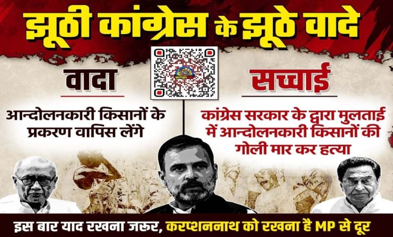 इन पोस्टर में पूर्व सीएम दिग्विजय सिंह पीसीसी चीफ कमलनाथ और कांग्रेस के पूर्व अध्यक्ष राहुल गांधी (Rahul Gandhi) का फोटो लगा है। साथ ही पोस्टर में लिखा है वादा आंदोलनकारी किसानों के प्रकरण वापस लेंगे। दूसरी तरफ लिखा है सच्चाई कांग्रेस सरकार के द्वारा मुलताई में आंदोलनकारी किसानों की गोली मार कर हत्या। वहीं, नीचे लिखा है कि इस बार याद रखना जरूर। करप्शनाथ को रखना है एमपी से दूर।