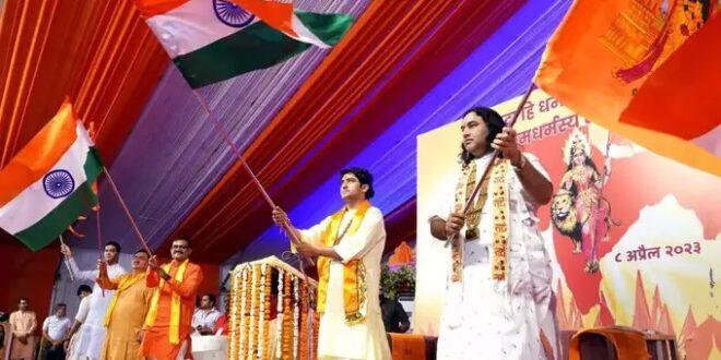 धीरेंद्र शास्त्री के आते ही मंच की तस्वीर पूरी तरह बदल गई। बैकग्राउंड में उनकी तस्वीर के साथ भारत माता की भगवा झंडे वाली तस्वीर लहराने लगी। बागेश्वर महाराज ने अपने संबोधन में वहीं बातें कहीं जो वे आम तौर पर कहते हैं। हिंदू राष्ट्र बनाओ। राम के बाद कृष्ण को विराजमान करो, लेकिन असली तस्वीर इसके बाद सामने आई। संबोधन खत्म होने के बाद धीरेंद्र शास्त्री और देवकी नंदन ठाकुर मंच पर खड़े होकर तिरंगा और भगवा झंडा लहराने लगे। इस दौरान वीडी शर्मा सहित बीजेपी के तमाम बड़े नेता और साधु-संत मंच पर मौजूद थे।