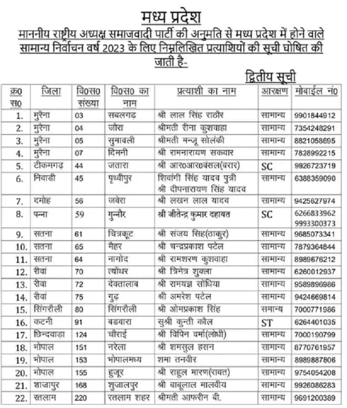 भोपाल । मध्य प्रदेश विधानसभा चुनाव के लिए समाजवादी पार्टी ने दूसरी सूची जारी कर दी है। पार्टी के राष्ट्रीय अध्यक्ष अखिलेश यादव की अनुमति से बुधवार देर शाम जारी इस सूची में 22 उम्मीदवारों के नाम घोषित किए गए हैं। सपा ने निवाड़ी जिले की दो सीटों पर मां-बेटी को टिकट दिया है।