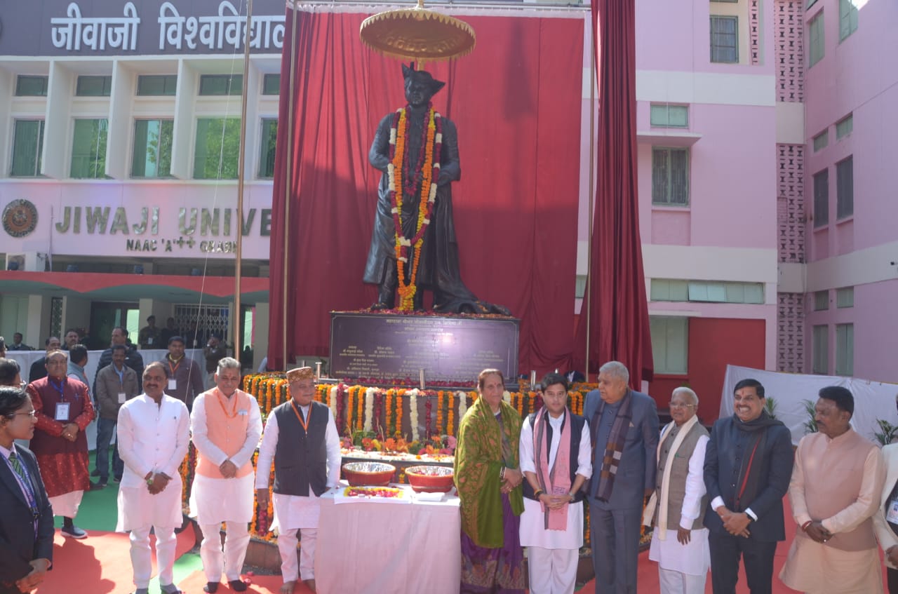 अंत में महामहिम ने इंडियन काउंसिल ऑफ वर्ल्ड अफेयर्स के साथ एमओयू का कहा साथ ही जेयू के छात्रों को भारतीय संसद में संवाद के लिए आमंत्रित किया। विशिष्ट अतिथि के रूप में मुख्यमंत्री डॉ. मोहन यादव, माननीय मंत्री, संचार एवं पूर्वोत्तर क्षेत्र विकास, भारत सरकार ज्योतिरादित्य सिंधिया, विधानसभा अध्यक्ष नरेंद्र सिंह तोमर,माननीय मंत्री, उच्च शिक्षा, तकनीकी शिक्षा एवं आयुष विभाग, मध्य प्रदेश इंदर सिंह परमार, माननीय मंत्री, जल संसाधन एवं प्रभारी मंत्री, ग्वालियर तुलसी सिलावट, राज्यमंत्री राकेश शुक्ला, श्रीमती सुदेश धनखड़ उपस्थित रहे। वहीं अध्यक्षता माननीय राज्यपाल एवं कुलाधिपति, मध्य प्रदेश मंगुभाई पटेल ने की। कुलगुरू प्रो. अविनाश तिवारी के स्वागत भाषण के साथ कार्यक्रम की शुरुआत हुई। इससे पूर्व अतिथियों द्वारा जीवाजी राव सिंधिया की प्रतिमा का अनावरण किया गया।साथ ही एक पेड़ मां के नाम पर पौधारोपण किया गया। जेयू की उपलब्धियों पर लगी प्रदर्शनी का शुभारंभ किया।कार्यक्रम में विशिष्ट अतिथि के रूप में उपस्थित डॉ. मोहन यादव ने कहा कि ज्ञान विज्ञान के समागम के माध्यम से हमारी सरकार ने काफी काम किया है। ऐसे महापुरुष की प्रतिमा का अनावरण किया जाना गौरव की बात है जिन्होंने शिक्षा स्वास्थ्य के क्षेत्र में अभूतपूर्व योगदान दिया। विशिष्ट अतिथि के रूप में उपस्थित ज्योतिरादित्य सिंधिया ने कहा कि जो शहर संगीत शिक्षा के लिए जाना जाता है, उसमें महामहिम का आगमन हुआ है यह गौरव की बात है। देश के लिए एक आधुनिक योग पीएम द्वारा लाया जा रहा है। एक सुनहरा युग बनने जा रहा है। ज्ञान से ही विनम्रता प्राप्त होती है। विनम्रता से ही पात्रता प्राप्त होती है। आज विश्वविद्यालय 250 एकड़ में स्थापित है जो मेरी दादी मां और डॉ . सर्वपल्ली राधाकृष्णन द्वारा पूजन किया गया था। जीवाजी विश्वविद्यालय अंतर्राष्ट्रीय स्तर पर नक्षत्र की तरह उभरता संस्थान है ।छात्र शिक्षा लेकर शिक्षित के साथ-साथ देश समाज का निर्माण करें।जो बीच बोया गया था वह 60 साल बाद वटवृक्ष की तरह खड़ा हो चुका है।हमारी संस्था आधुनिक युग की ओर अग्रसर है जो संस्थापकों की विचारधारा थी उससे दस कदम आगे संस्था बन चुकी है। सिंधिया परिवार का शिक्षा के प्रति हमेशा समर्पण रहा है। कार्यक्रम का संचालन डॉ. सपन पटेल ने किया।इस मौके पर कार्य परिषद सदस्य,विवि के प्रौफेसर, अधिकारी एवं कर्मचारी सहित छात्र एवं छात्राएं उपस्थित रहे।
