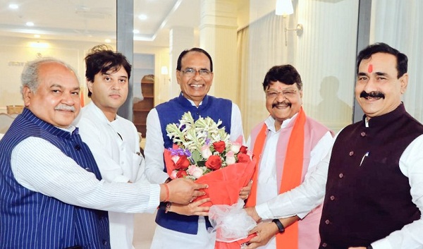 भोपाल। केंद्रीय कृषि एवं किसान कल्याण मंत्री नरेंद्र सिंह तोमर और केंद्रीय नागर विमानन मंत्री ज्योतिरादित्य सिंधिया ने शनिवार देर शाम भोपाल प्रवास के दौरान मुख्यमंत्री निवास पहुंचकर मुख्यमंत्री शिवराज सिंह चौहान से सौजन्य भेंट की और उन्हें जन्मदिन की अग्रिम बधाई दी। इस मौके पर प्रदेश के गृह मंत्री डॉ. नरोत्तम मिश्रा और भाजपा के राष्ट्रीय महासचिव कैलाश विजयवर्गीय भी मौजूद रहे।