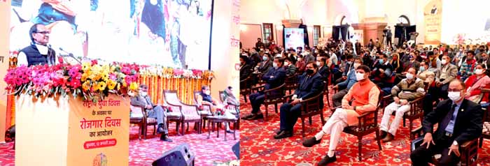 मुख्यमंत्री चौहान आज कुशाभाऊ ठाकरे सभागृह में रोजगार दिवस के राज्य स्तरीय कार्यक्रम को संबोधित कर रहे थे। स्वामी विवेकानंद जयंती, राष्ट्रीय युवा दिवस के अवसर पर हुए इस कार्यक्रम में मुख्यमंत्री चौहान ने स्वामी विवेकानंद की तस्वीर के समक्ष दीप जलाकर कार्यक्रम का शुभारंभ किया। सूक्ष्म, लघु, मध्यम उद्यम मंत्री ओम प्रकाश सखलेचा, विधायक श्रीमती कृष्णा गौर तथा म.प्र. कौशल विकास एवं रोजगार निर्माण बोर्ड के अध्यक्ष शैलेंद्र शर्मा भी उपस्थित थे।